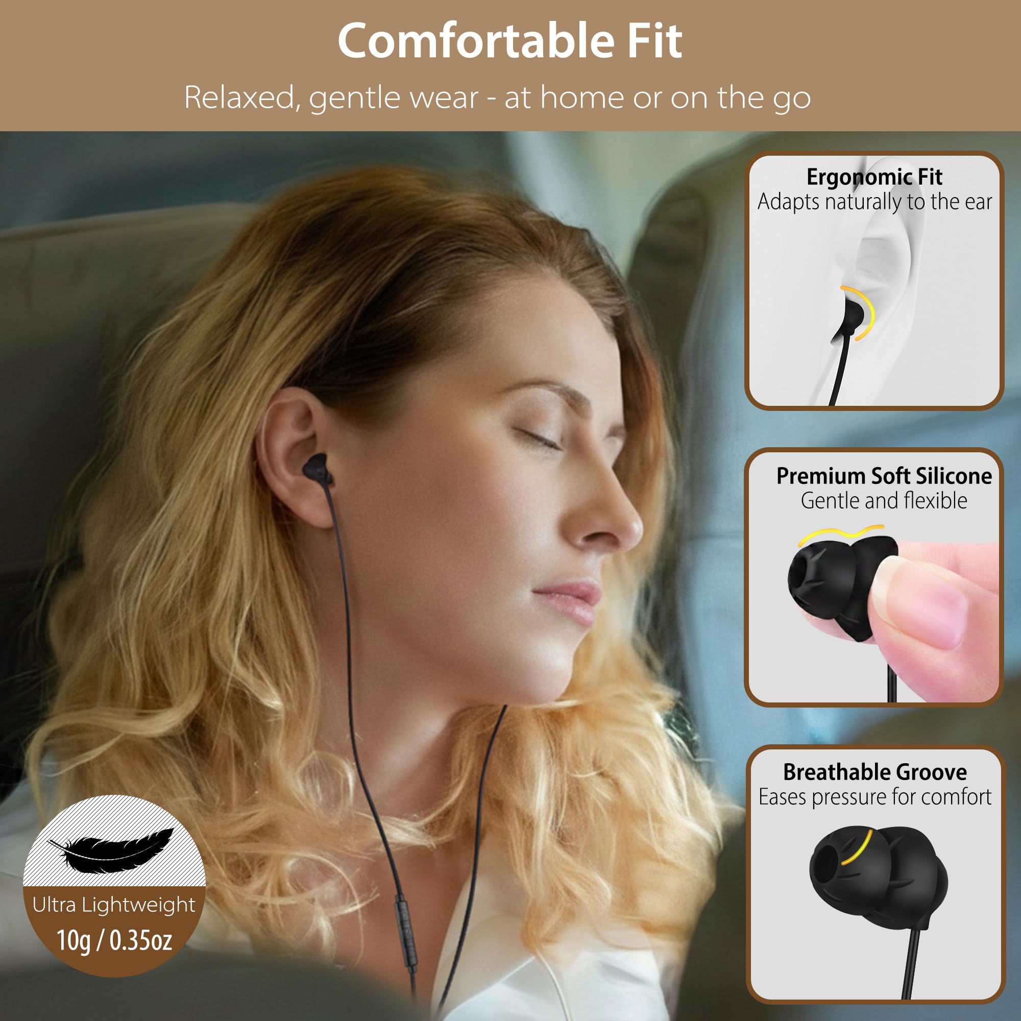 9. In conclusion, the Best Price 3.5mm Wired Sleep Earbuds offer a comfortable and effective solution for restful sleep and relaxation. With their ultra-lightweight design, soft earphones, dual-layer noise isolation, and built-in microphone, these earbuds deliver clear HiFi sound while minimizing external disturbances. Ideal for sleeping, managing snoring, insomnia, or enjoying peaceful travel, they provide both comfort and functionality at an affordable price.
